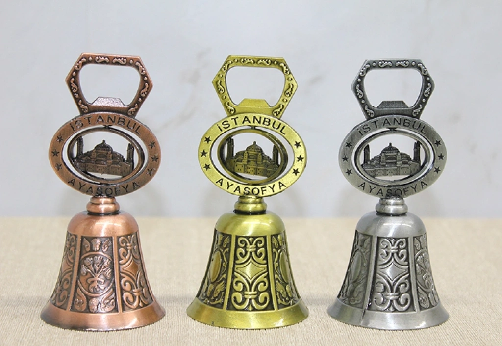 AÇACAKLI AYASOFYA TEMALI EL ÇANIÜrün ÖzellikleriAçacaklı Ayasofya Temalı El Çanı, dekoratif tasarımı ve fonksiyonel yapısıyla hem estetik hem de kullanışlı bir üründür. 10,5 cm boyutundaki kompakt formu sayesinde masaüstü, raf ve vitrin dekorasyonunda şık bir tamamlayıcı olarak tercih edilebilir. Üzerinde yer alan Ayasofya temalı detaylar ürüne turistik ve koleksiyonluk bir karakter kazandırır. Alt kısmında bulunan açacak fonksiyonu sayesinde yalnızca dekoratif değil, aynı zamanda pratik kullanım imkânı da sunar. Metal gövde yapısı sağlam bir duruş oluştururken klasik görünümüyle dikkat çeker. Gönderim sırasında görselde yer alan renklerden biri karışık olarak gönderilmektedir. Hem süs hem kullanım avantajı sunan bir açacaklı el çanı modelidir. Şehir simgeli tasarımıyla öne çıkan dekoratif bir Ayasofya temalı metal çan alternatifidir.Ürün Teknik ÖzellikleriÖzellikAçıklamaÜrün AdıAçacaklı Ayasofya Temalı El ÇanıBoyut10,5 cmMalzemeMetalÖzellikAçacak FonksiyonluTemaAyasofya TasarımıRenkGörseldeki Renklerden Biri Karışık Olarak GönderilirKullanım AlanıDekoratif ve Açacak Amaçlı KullanımPaket İçeriği1 Adet Açacaklı Ayasofya Temalı El Çanı