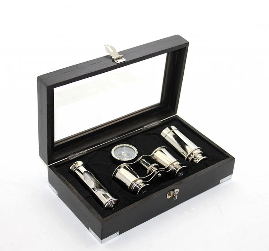 Ahşap Kutulu Pirinç Dürbün Pusula Ve Kumsaati Seti 3944A