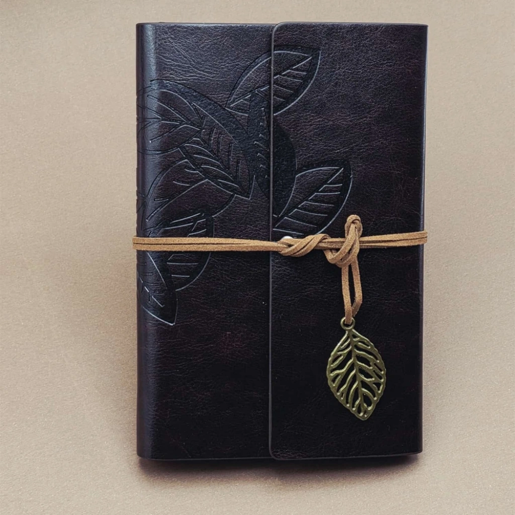 Siyah yapraklı deri defter tasarımı ve görünümü çocuktan yetişkine herkesin hoşuna gideceği defter çeşitlerinden.