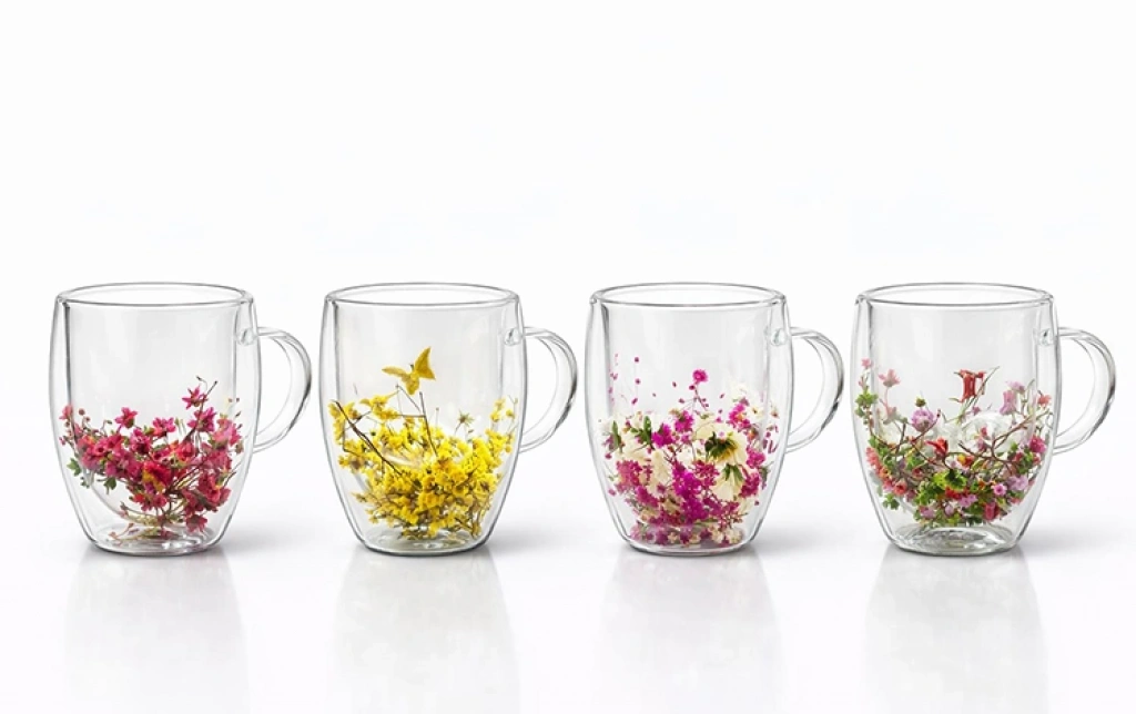 Çift Camlı Çiçekli Borosilikat Kupa Bardak