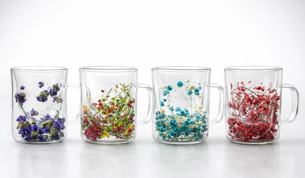Çift Camlı Çiçekli Borosilikat Kupa Bardak - Model 3