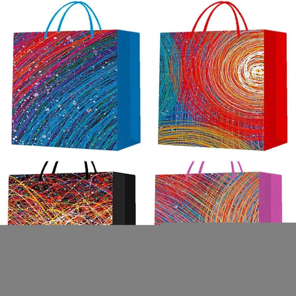 Karton çanta üzerinde bulunan renkli farklı tasarım baskısı ilginç bir görünüm vermekte.