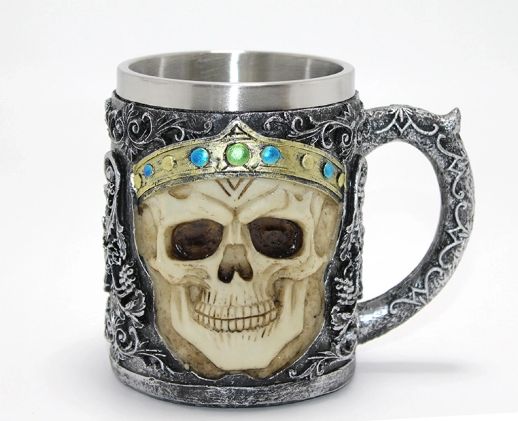 Taçlı Kurukafa Kralı 3D Kabartmalı Çelik Kupa Bardak